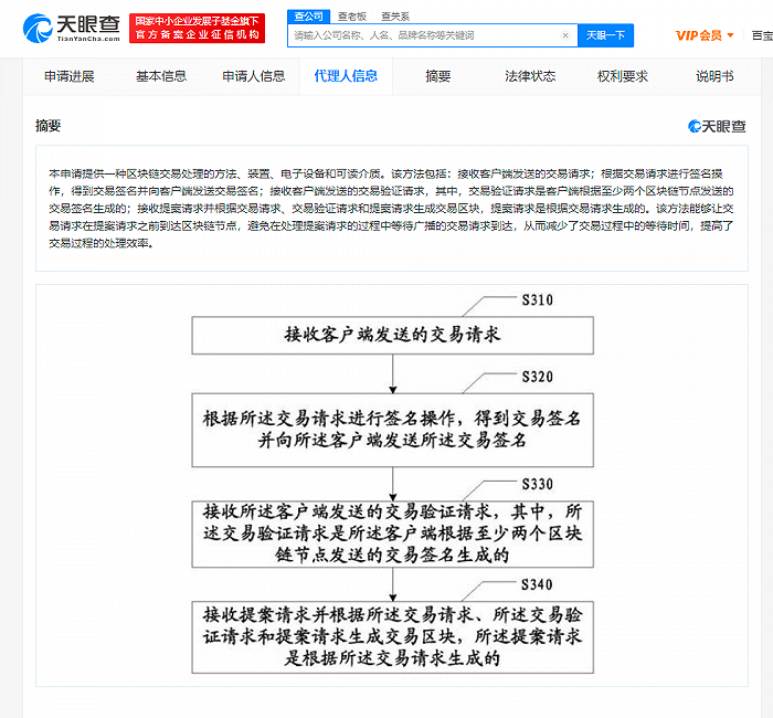 专利摘要显示,该方法包括:接收客户端发送的交易请求;根据交易请求进行签名操作,并向客户端发送交易签名;接收客户端发送的交易验证请求。该方法能够让交易请求在提案请求之前到达区块链节点,减少交易过程中的等待时间,提高处理效率。