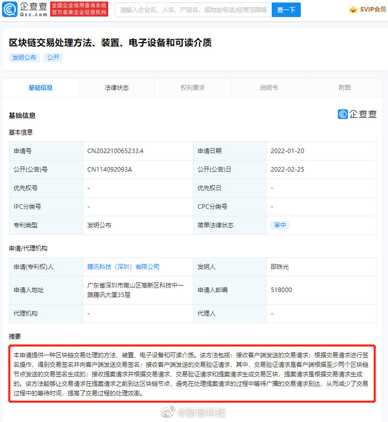 摘要: 【#腾讯区块链交易专利公开#】企查查APP显示,近日,腾讯科技(深圳)有限公司申请的"区块链交易处理方法、装置、电子设备和可读介质"专利公开。摘要显示,该方法包括:接收客户端发送的交易请求;根据交易请求进行签名操作等,该方法能够减少交易过程中的等待时间,提高交易过程的处理效率。#腾讯公布区块链交易专利#