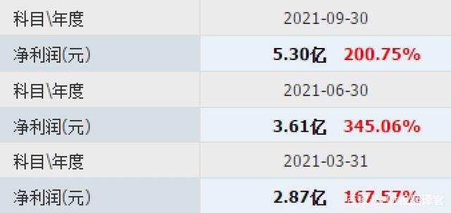 报告期内,一季度的净利润为2.87亿元,同比增长了168%;二季度的净利润为3.61亿元,同比增长了345%;三季度的净利润为5.3亿元,同比增长了201%。