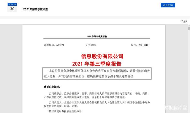 而本文既没有推荐航天信息这只股票,也没有说航天信息公司有多么的好,而是精炼翻译该企业的财报。