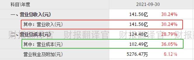 2021年第三季度,该企业的营业收入同比增长了30%。而对应的营业成本,却大幅提高了36%