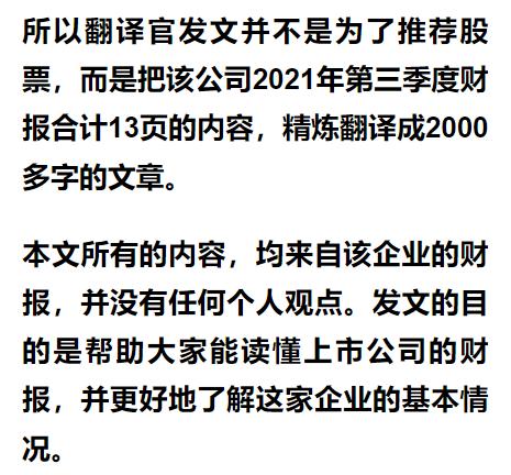 以下内容和财务数据均源自该公司2021年第三季度财报中,第6页的合并资产负债表,和第9页的合并利润表,并没有任何个人观点。