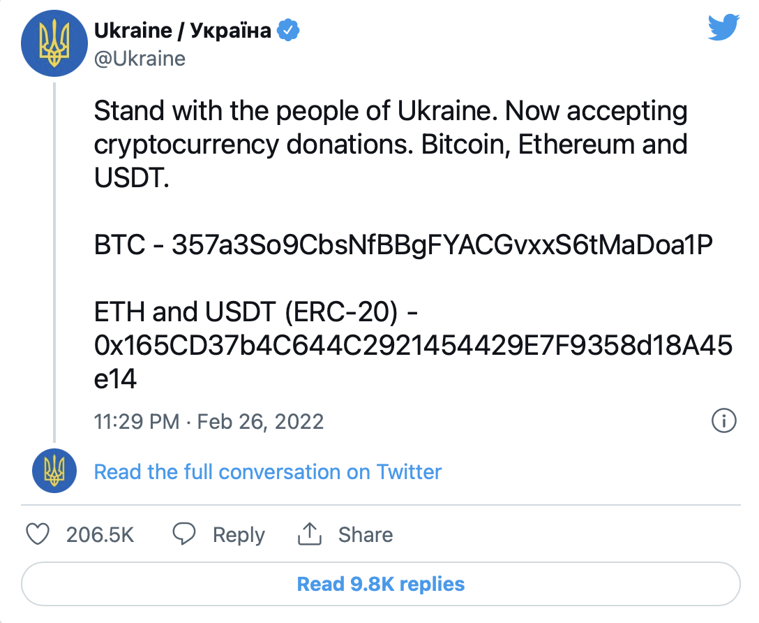 2 月 26 日,乌克兰官方 Twitter 账号发出推文,呼吁全球网民捐款用来「支持乌克兰人民」。推文中直接给出了比特币和以太坊两个钱包账户,用来接收比特币、USDT 以及包括以太坊在内的以太坊区块链代币捐赠。