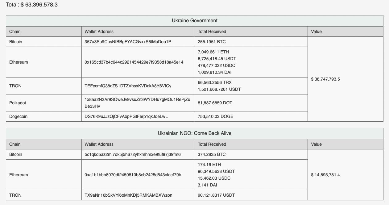 乌克兰总统与副总统发布了多个加密货币收款地址,并且经过以太坊创办人Vitalik Buterin 认证,就此打开了全球金援通道,短短几天之内,包括比特币、以太币等多种加密货币大量涌入乌克兰政府和非政府组织的数位钱包,估计总额接近7 千万美元。