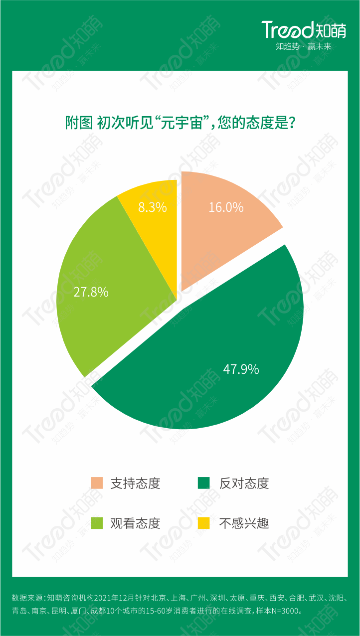 报告显示,消费者初次听见“元宇宙”并持反对态度的消费者占47.9%,其中00后占到72.7%。而持积极支持态度的消费群体占到16.0%,其中只有80、90后占到18%多,00后仅占10%。