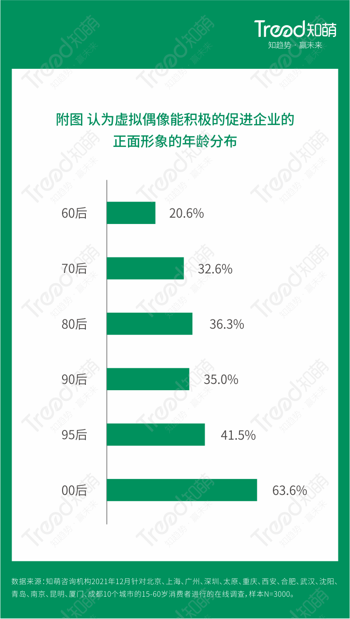 对于品牌来说,年轻消费者对于虚拟偶像的追捧也为品牌营销带来新机会。根据知萌咨询发布的《2022中国消费趋势报告》(以下简称“报告”)显示,有35.9%的消费者认为虚拟偶像能积极促进企业的正面形象,在这部分消费者中,00后人数比例最大,占63.6%,95后紧随其后,占41.5%。整体来看,越年轻的消费群体对虚拟偶像的价值认可态度越积极。