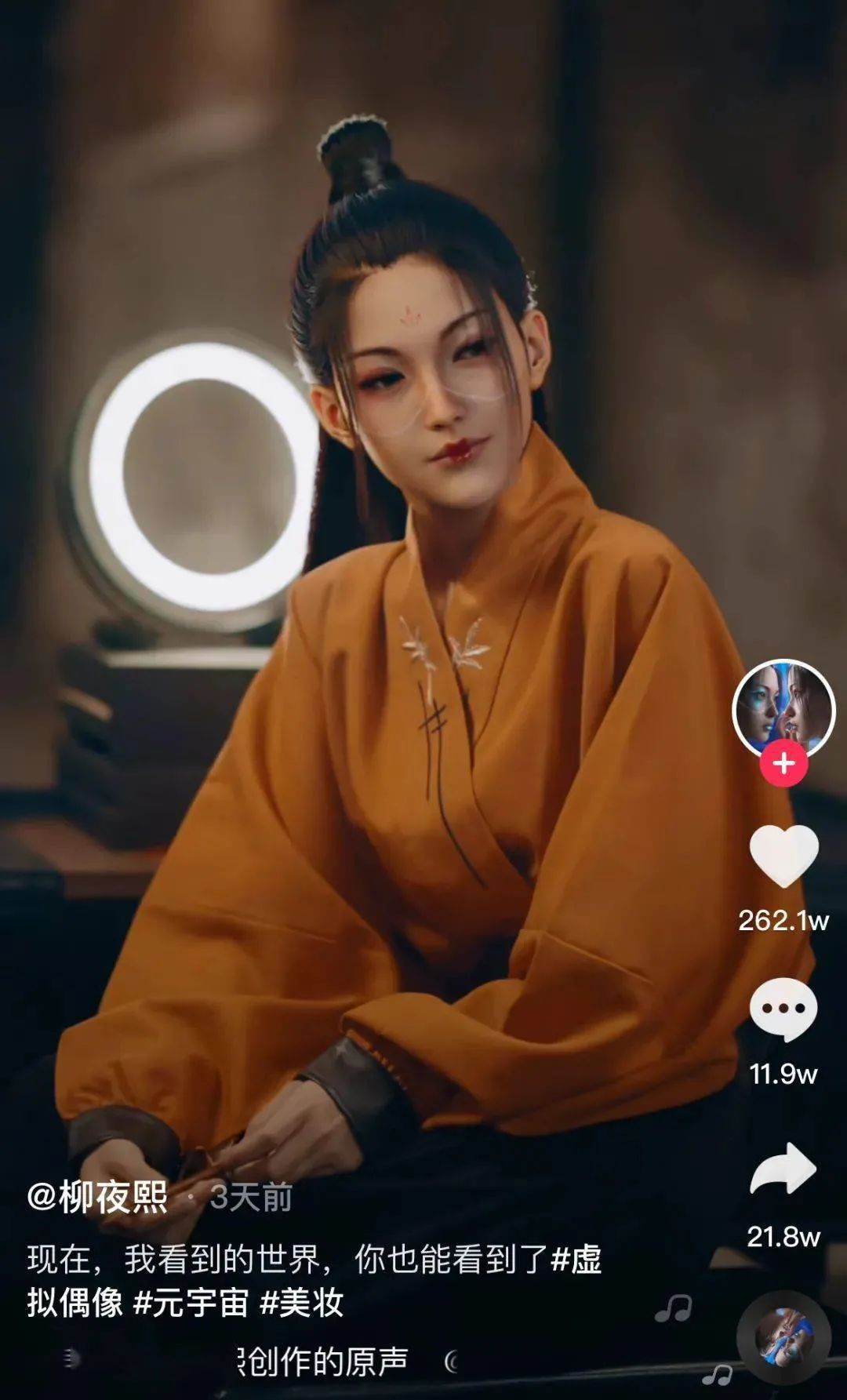 在这个短短2分钟的视频中,赛博朋克和奇幻古风的场景交叉上演,视频发布当晚5小时内就获赞 247.7万。一时间,#柳夜熙 #柳夜熙是谁 等各种相关话题迅速发酵,“虚拟偶像”、“元宇宙”等概念的传播度直线上升。