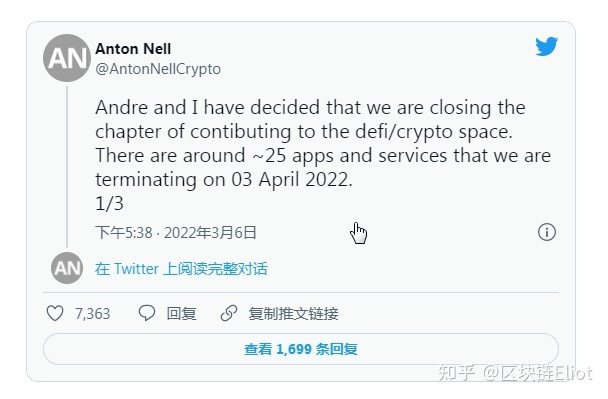 AC在春风得意的时候,以糙、快、猛的风格而著称。最夸张的时候几乎一周推出一个新项目。每个项目甚至不等他推特官宣,就有人监控他的部署地址看到新部署了合约,然后几十万、上百万美元的资金就涌了进去。其中也出现过多次合约未经审计出现漏洞,从而导致大量资金被盗的情况。但也可以足见其神一般的存在。按照此次官宣与他一同退出的Anton Nell的说法,他们退出后,大约将有25个app或各类服务在2022年4月3号被终止。
