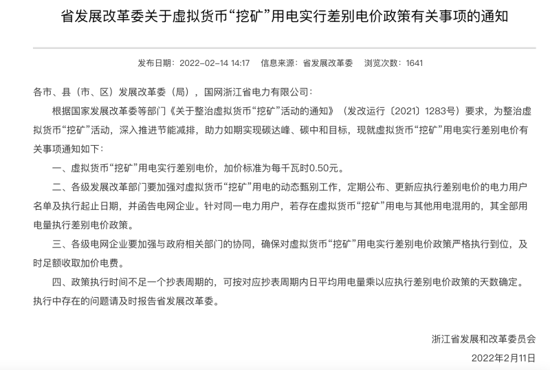2 月 14 日,浙江省发改委发布《关于虚拟货币挖矿用电实行差别电价政策有关事项的通知》。据通知内容显示,为整治虚拟货币挖矿活动,深入推进节能减排,助力如期实现碳达峰、碳中和目标,浙江省内虚拟货币挖矿用电将实行差别电价,加价标准为每千瓦时 0.50 元。