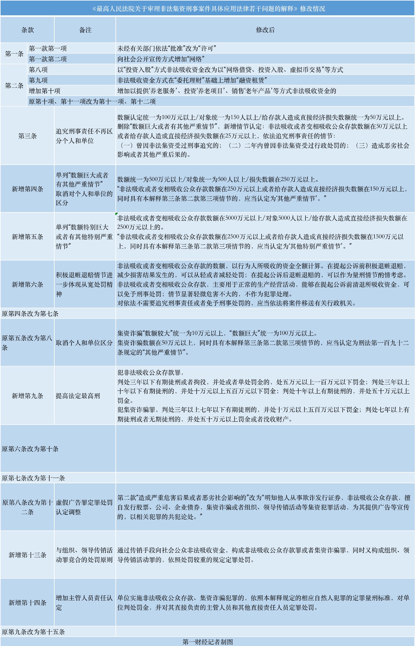 具体来看,修改后的《解释》条文从9条增加至15条,主要对原来的5个条文做出修改,修改内容涉及非法吸收公众存款罪、集资诈骗罪的定罪量刑标准,特征要件和行为方式、罚金金额标准。同时,新的《解释》还明确了两项罪责与组织、领导传销活动罪竞合处罚原则等。