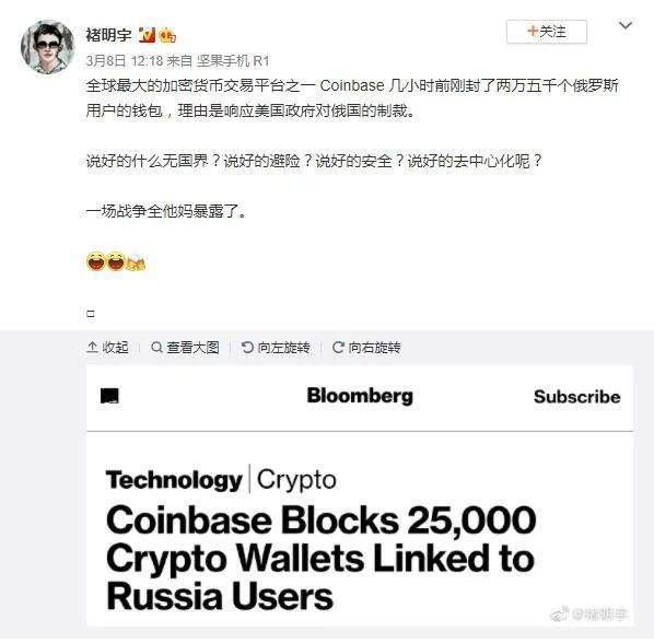 他写道:“全球最大的加密货币交易平台之一 coinbase 几小时前刚封了两万五千个俄罗斯用户的钱包,理由是响应美国政府对俄国的制裁。说好的什么无国界?说好的避险?说好的安全?说好的去中心化呢?一场战争全他妈暴露了。”