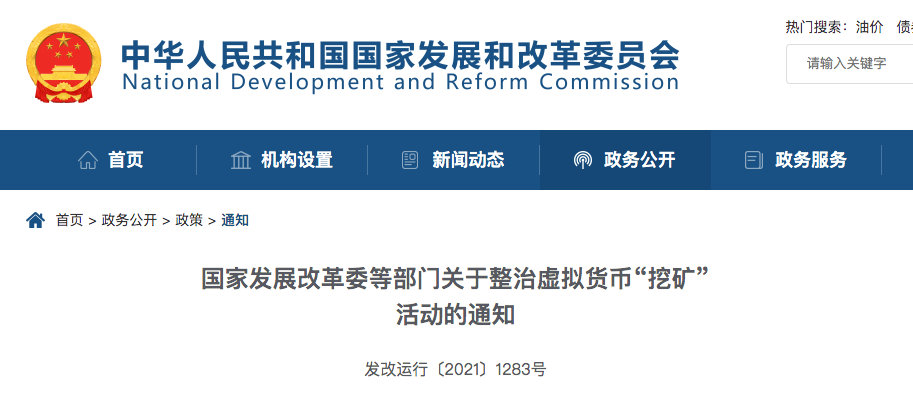 2021年9月,国家发改委等部门联合发布《关于整治虚拟货币“挖矿”活动的通知》要求全面梳理排查虚拟货币“挖矿”项目,严禁新增项目投资建设,加快存量项目有序退出。