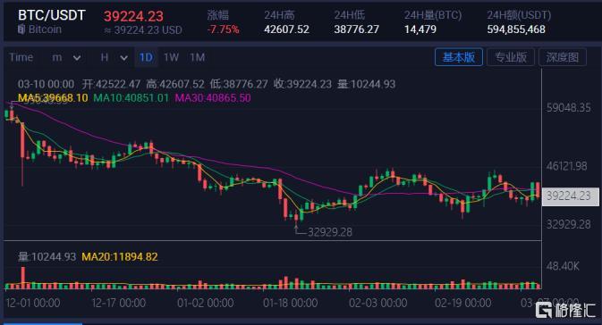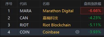 格隆汇3月10日丨区块链股盘前集体下跌,Marathon Digital跌6.6%,Riot Blockchain跌5.1%,嘉楠科技跌4.2%,coinbase跌3.9%。比特币现跌7.75%,报39224.23美元/枚,盘中一度失守39000美元/枚。