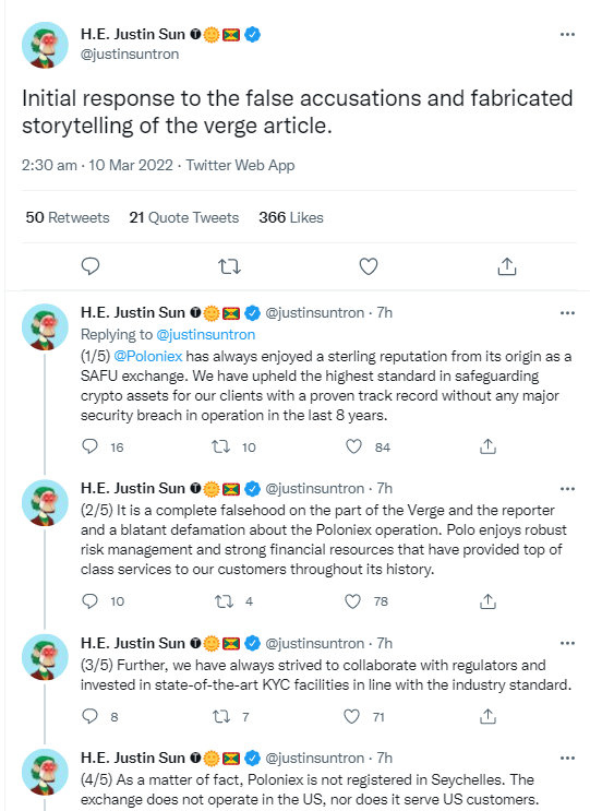 孙宇晨称,作为SAFU交易所,Poloniex一直享有良好的声誉。对于被指涉嫌内幕交易一事,孙宇晨表示:“这是Verge和记者的完全谎言,是对Poloniex运营的公然诽谤。”