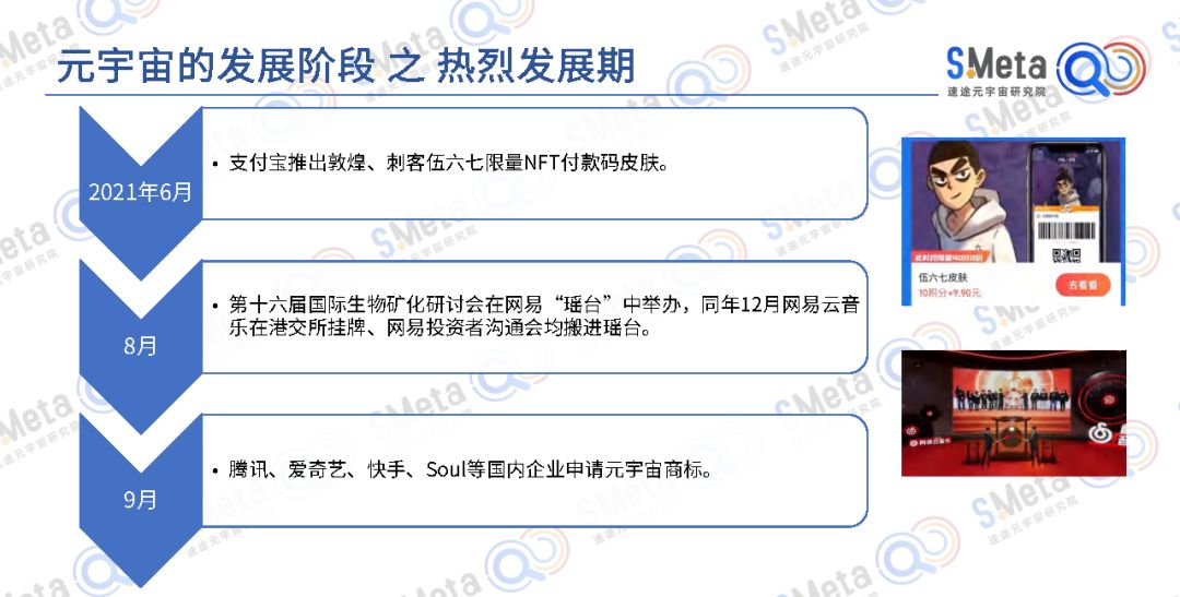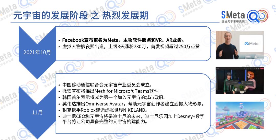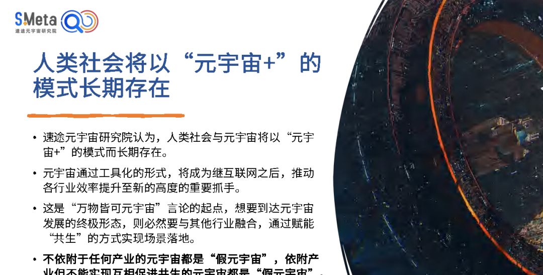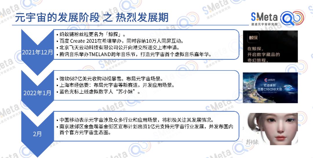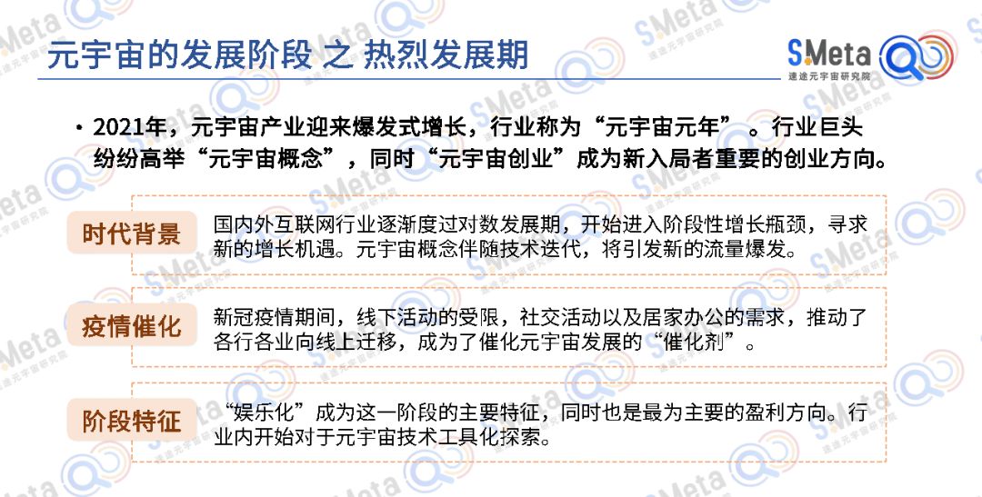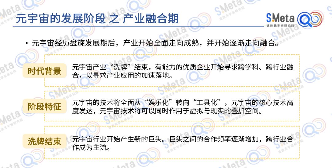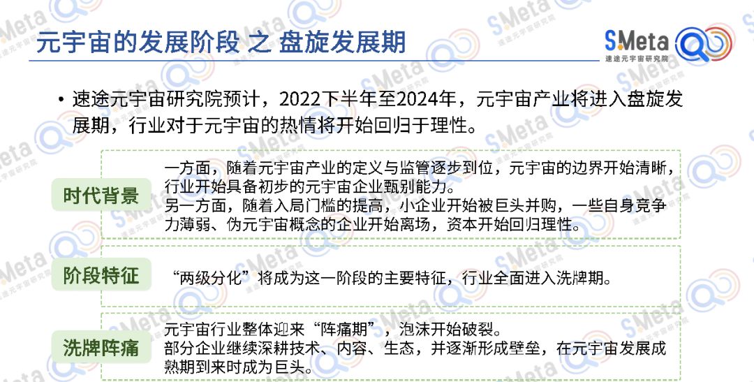 2021年是元宇宙“元年”,全球大型互联网企业纷纷下场元宇宙,随着行业监管逐渐完善与元宇宙的边界逐渐清晰,速途元宇宙研究院预计,在行业对元宇宙的热情逐渐回归理性,2022年下半年至2024年,元宇宙产业将进入盘旋发展阶段,最终将在融合发展中形成一个完全去中心化的、拥有闭环经济系统与内容生态的虚拟空间。