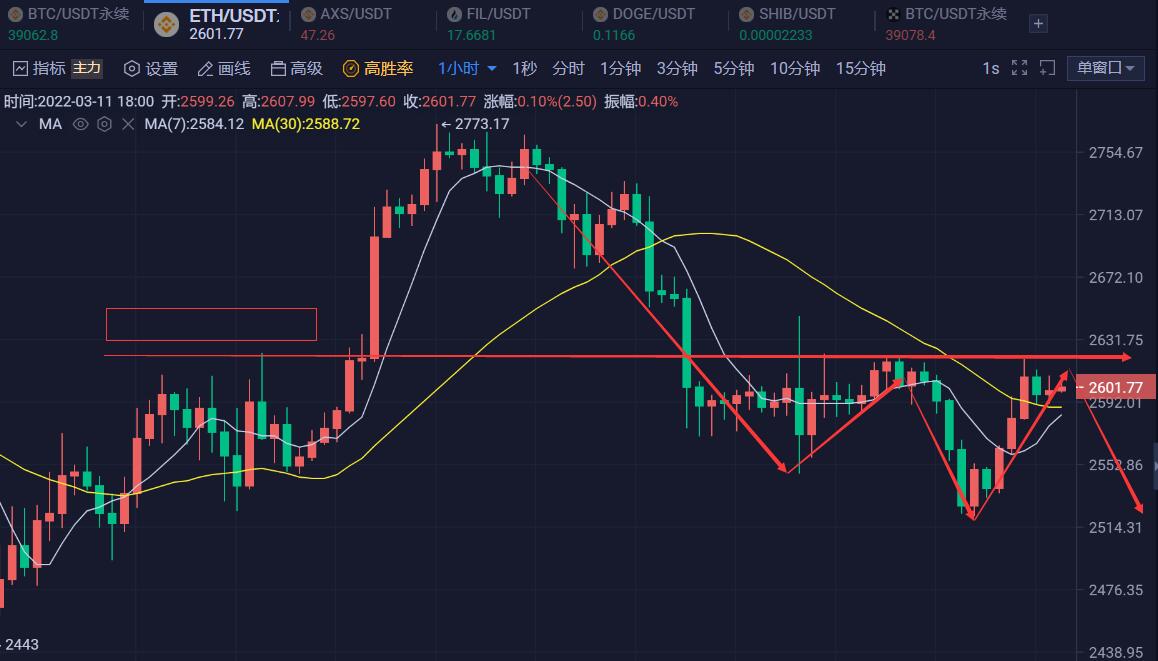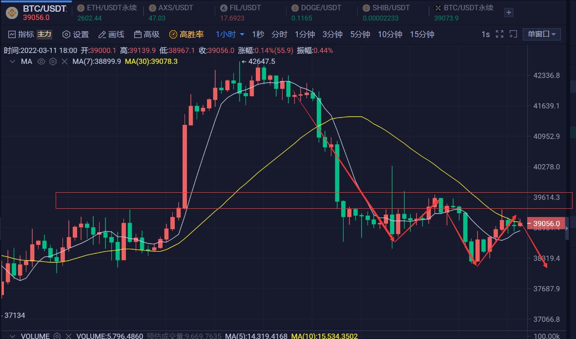 先说大方向,其实就大趋势来说不管是大饼还是以太都还是处于大方向下跌趋势当中,之前的拉升之后能够延续的话倒是能构成反转看涨信号,但很遗憾,昨日的下跌打破了多头的预期,且就日线上面来看的话构成乌云盖顶的看跌信号,短期内大方向还是偏向空头。小时线来看,比特币下跌之后反弹触及上方压力位69500-40000之后开始滞涨,走势纠结,小时线存在变盘的信号,短期内拐头向下的可能性很大,日线又是偏向于空头,那么日内操作上面就很明显的做出选择了,反弹上方压力位不破开始做空靠谱些。思晚间操作路,利用行情向39500-40000压力区间反弹的机会进场空单,止损带40400一线,目标先看38200一线日内低点能否破位。