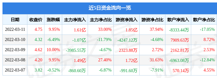 摘要: 中嘉博创涨停收盘,收盘价4.75元。该股于9点36分涨停,未打开涨停,截止收盘封单资金为8594.47万元,占其流通市值2.08%。资金流向数据方面,当日主力资金净流入1.61亿元,游资资金净流入1.85亿元,散户资金净流出8333.44万元。近5日资金流向一览见下表:该股为区块链,东数西算,5G概念热股。以上内容由证券之星根据公开信息