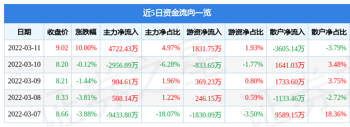 资金流向数据方面,当日主力资金净流入4722.43万元,游资资金净流入1831.75万元,散户资金净流出3605.14万元。近5日资金流向一览见下表: