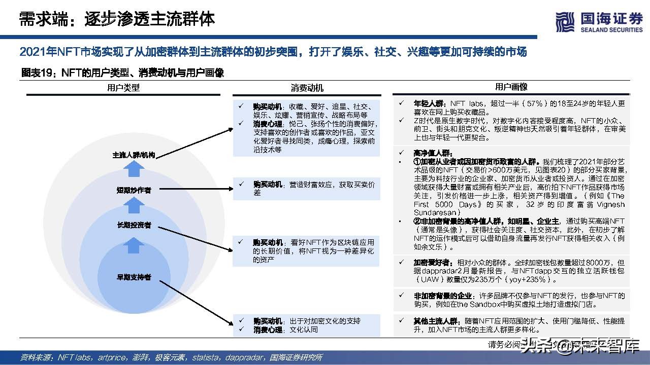 价格相对亲民的NFT的用户画像则更靠近主流群体。以体育NFT为例:体育NFT可能是目前用户类型较为广泛、破圈较为成功的NFT类型,买家并不局限于加密货币使用者,关注加密货币和前沿技术的买家仅占所有买家的22%(如图)。据麦肯锡2021年 4月针对2500名18-65岁消费者的调研,体育NFT用户可大致分为四类。四类买家群体收集卡牌的比例都较高,从38%到58%,收藏卡片的人群和够买体育NFT的人群相对重合;收藏型、社群型买家合 计人数占比达到44%,支出占比为38%。(报告来源:未来智库)