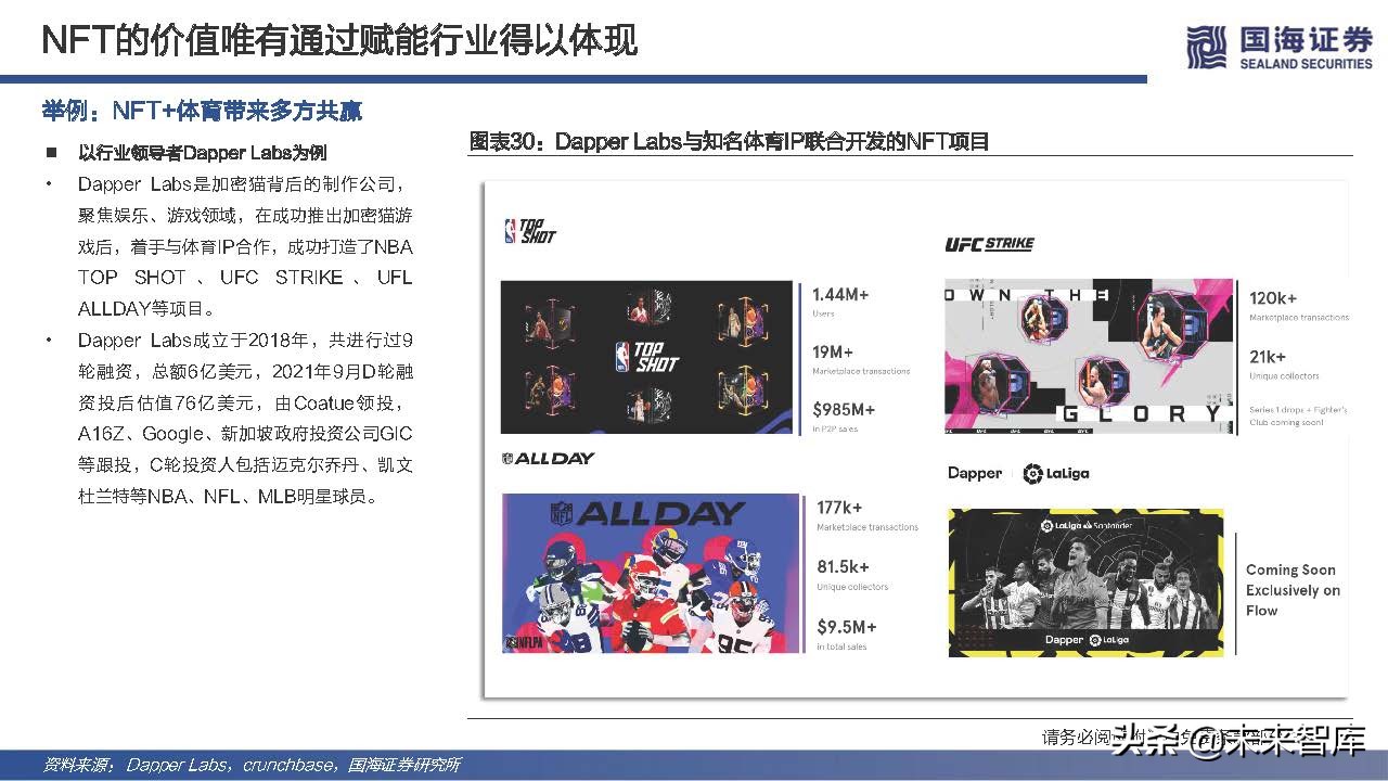 就职业体育联盟和运动员而言:NFT带来新的增强粉丝参与的方式,成为俱乐部生态的补充,能够进一步放大明星的品牌价值 ;