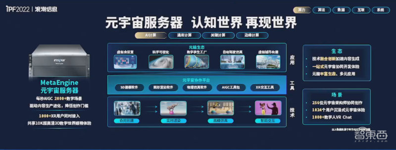 面向AI计算及元宇宙应用,彭震宣布推出浪潮元宇宙服务器MetaEngine,目标是构建软硬一体化基础设施,服务于大规模、高复杂、高逼真数字场景协同创建和实时渲染仿真。