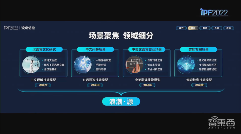 此外,浪潮公布了由大模型“源”生成的最新技能模型,分别面向知识增强对话、知识检索问答、中英文翻译、古文理解等四个专业领域。