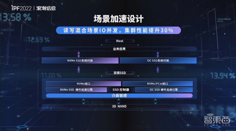浪潮的存储软件与SSD固件智能联调,可将IO处理效率提升35%。同时在SSD中,浪潮采用了最新的ZNS数据分流技术,可将分流存储数据性能提升210%,每GB成本下降60%。