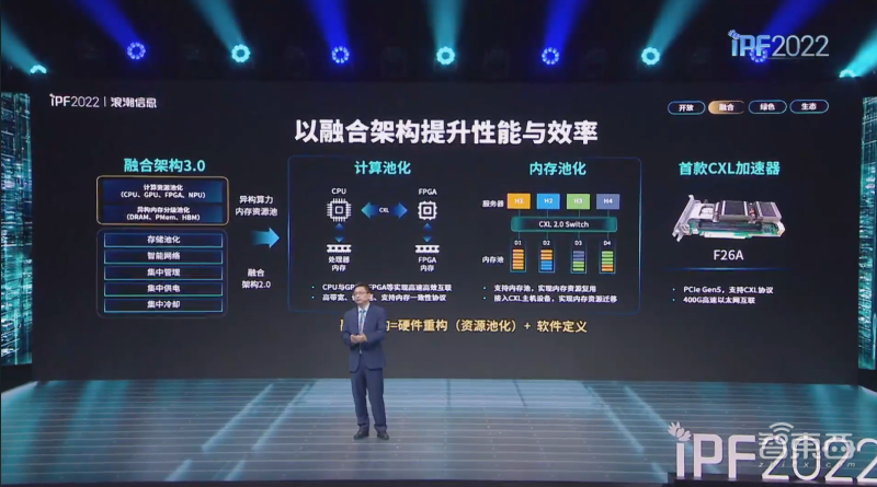 在跨节点级,智能数据处理单元(iDPU)和高速网络形成分布式互连交换,可实现CPU、GPU、FPGA、各种加速芯片的算力协同以及内存池化、新型存储池化,节点间的数据访问延迟可低至亚微秒级。