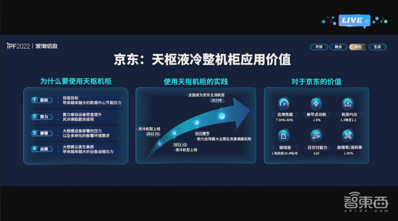 因此,京东联合浪潮在2019年开始进行天枢整机柜的研发。在去年上半年618之前,其风冷版本开始规模上线部署;到“双十一”,其液冷版本开始规模化投用。再加上京东承接的虎年春晚红包互动,这一次又一次的大流量考验,验证了天枢服务器的可靠性与稳定性。