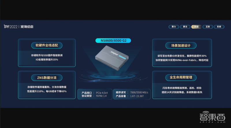 今天,浪潮信息还推出了其新一代SSD高速存储介质NS8600/8500 G2。它支持PCIe 4.0接口和NVMe 1.4协议,可为全栈存储提供从协议到存储介质的全链条优化功能。