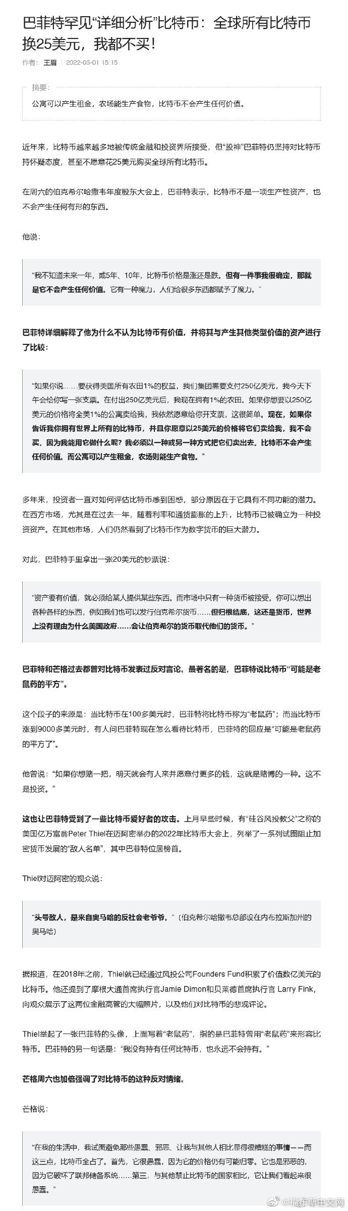 【#巴菲特解释为何不相信比特币#:全球所有比特币换25美元,我都不买[吃瓜]】在周六的伯克希尔哈撒韦年度股东大会上,巴菲特表示,比特币不是一项生产性资产,也不会产生任何有形的东西。他表示,“我不知道未来一年,或5年、10年,比特币价格是涨还是跌。但有一件事我很确定,那就是它不会产生任何价值。它有一种魔力,人们给很多东西都赋予了魔力。”