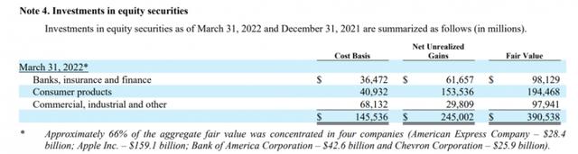 SEC文件显示,截至第一季度末,伯克希尔哈撒韦公司对雪佛龙的投资为259亿美元,相当于持有约1.59亿股,这高于该集团在2021年第四季度末持有的约3800万股。除了雪佛龙外,伯克希尔一季度末还持有1591亿美元的苹果、426亿的美国银行和284亿美国运通股票,四家占到整体投资组合的66%。