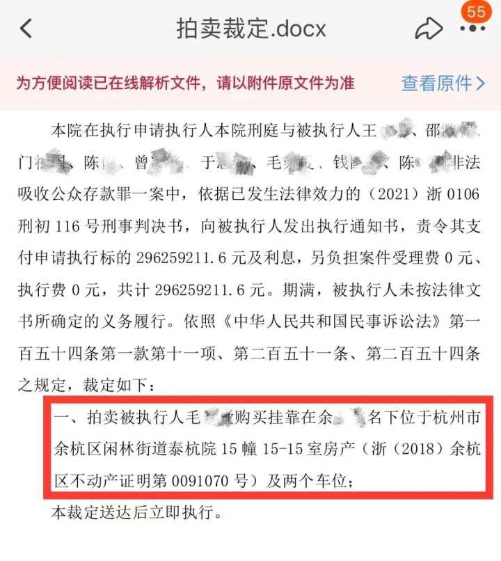 根据拍卖裁定书,这套房子背后涉及到一起非法吸收公共存款罪,涉案金额将近3亿元。房子为该案件中其中一位案犯购买,但挂靠在其他人名下。