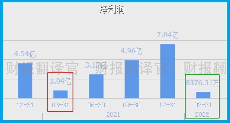 2021年第一季度,公司的业绩为1.04亿元。而到了2022年第一季度,该企业的净利润降至8376万元,同比下滑了19%。