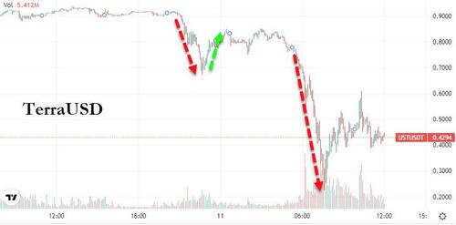 除了美国4月CPI消费者通胀超预期增长,加速了投资者逃离与美股正相关度越来越高的加密货币风险资产之外,主流数字货币、特别是比特币跳水也与稳定币UST失去与1美元挂钩有关。