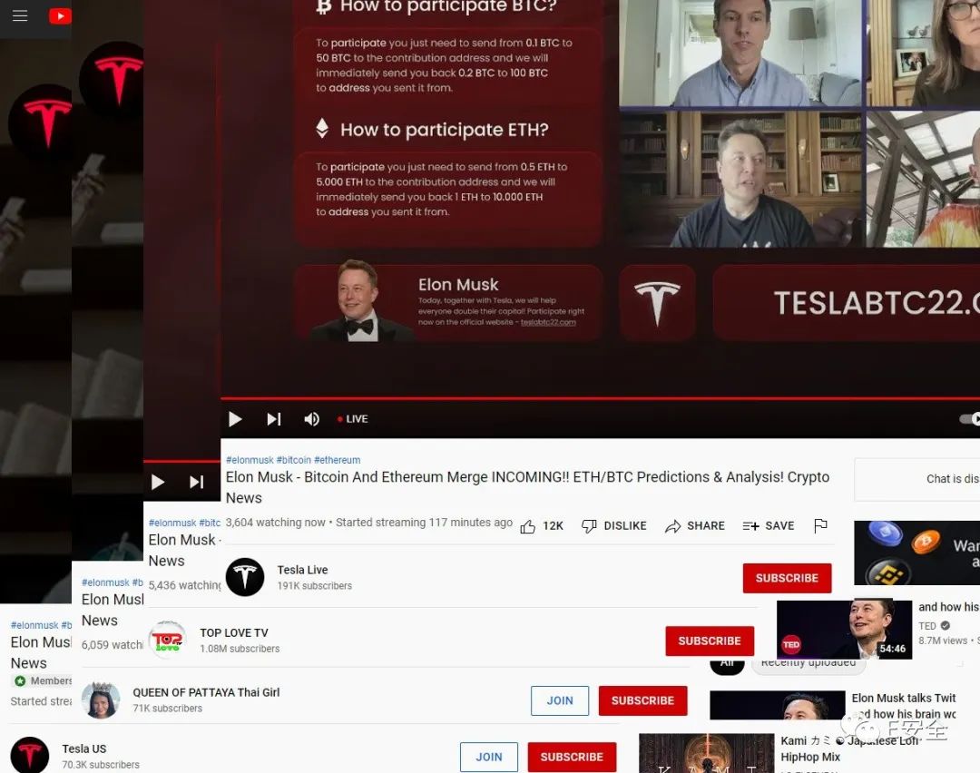 通过快速浏览当前所有的诈骗视频发现,诈骗者在5月7日又窃取了10万美元,有9个YouTube频道在引诱加密货币用户进入诈骗网站,几乎所有的内容都包括特斯拉、埃隆·马斯克、方舟投资等字样。