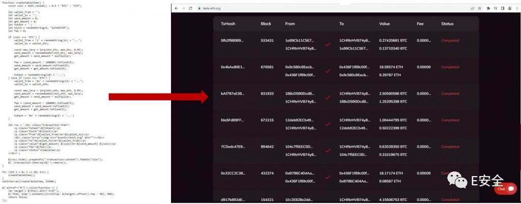 为了创建假表格,骗子使用JavaScript代码生成一个随机加密货币钱包和支付金额的列表。