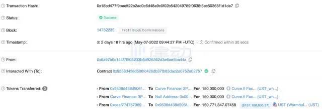 LFG为了保持3Crv池流动性的平衡,又从资金池中撤走了1亿美元的UST。