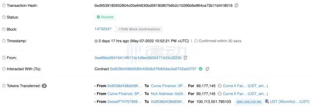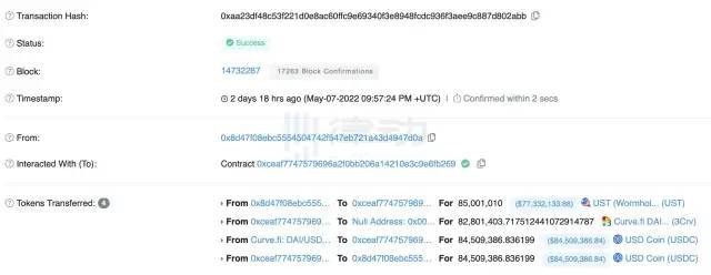 约10分钟后,一个新地址突然抛售了价值8400万美元的UST,瞬间影响了3crv池原本的平衡。
