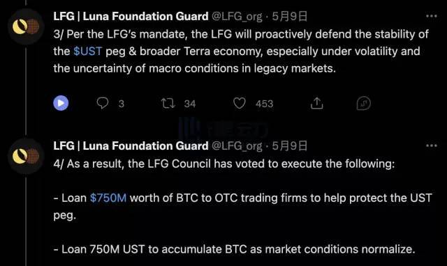 此时LFG想要用比特币来“撑场”了,它发推特宣布将“贷出”自己7亿美元的比特币储蓄,希望通过UST和比特币(而不是UST与暴跌的Luna)之间的相互兑换来维护UST的稳定。
