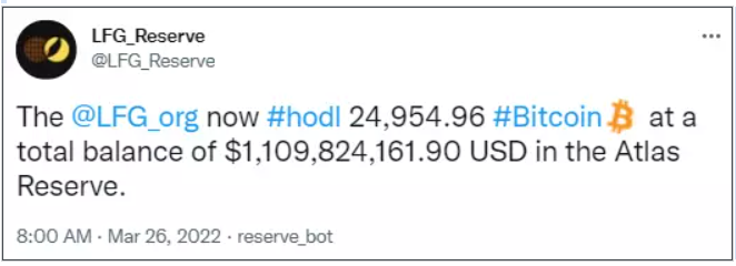 故事开始于 3 月下旬,LFG 宣布开始购买 BTC,放进国库来帮助支持 UST。于是 LFG 于 3 月 22 日开始增持 BTC,到 3 月 26 日便拥有 10 亿美元以上的 BTC 头寸。这为 UST 的“破碎战争”,埋下了伏笔。