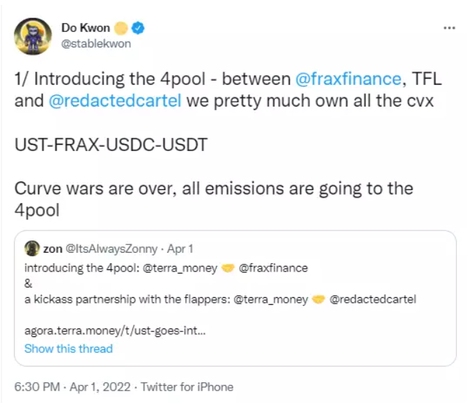时间来到 4 月 1 日,第二回合展开,4pool Frax 宣布了 UST 加入,“索罗斯”也终于在这里抓住了漏洞,他的进攻要开始了。