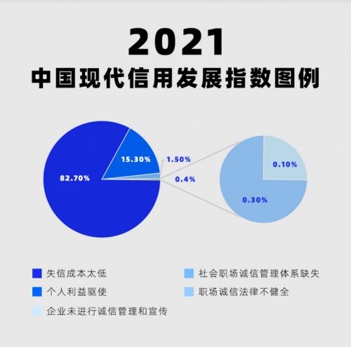2021年6月-7月,《小康》杂志社联合国家信息中心,并会同有关专家及机构,对“2021中国现代信用发展指数”进行了调查。结果显示,“失信成本太低”“个人利益驱使”“社会职场诚信管理体系缺失”“职场诚信法律不健全”“企业未进行诚信管理和宣传”成为公众认知中职场失信问题发生的主要原因,占比分别达到82.7%、15.3%、1.5%、0.3%、0.1%。