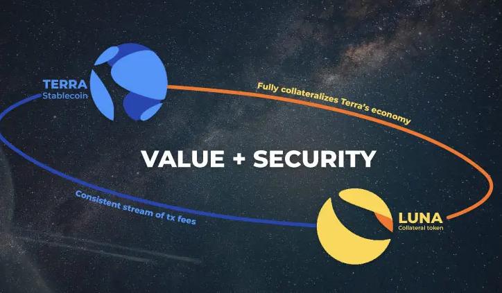 Terra 的算法说起来也不难理解,简单来说就是发了两个币,一个叫 UST ,一个叫 LUNA 。其中 UST 就是那个稳定币, 1 UST 对标 1 美元。而 LUNA 算是 UST 的金库,属于 UST 的后备力量。之间的机制是, 1 个 UST 和价值 1 美元的 LUNA 币( LUNA币价格不固定 )之间可以相互兑换。