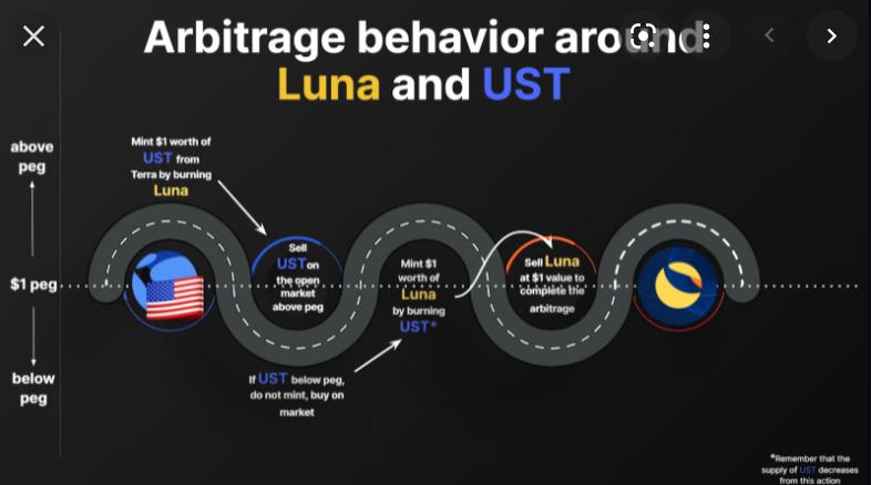 差评君举个例子啊,当 1 UST = 1.5 美元时,倒爷们会花 1 美元买些 LUNA 币,然后利用 Terra 的设定,换成 1 个 UST 卖出。这样倒爷就稳赚了 0.5 美元,同时在倒爷们的疯狂搬运下, LUNA 币数量减少,价格上涨;UST 逐渐增多,价格开始下降。反过来,当 1 UST = 0.5 美元时,倒爷们就会花 0.5 美元买下 1 个 UST ,再利用相互换的机制,兑换成价值 1 美元的 LUNA 币卖出。这样倒爷也是稳赚 0.5 美元,同时因为这些操作,市场上的 LUNA 币数量增多,价格下降;而 UST 的数量会减少,价格渐渐上涨。