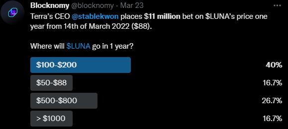 但质疑的声音也渐渐开始出现。毕竟其他稳定币,好歹有在银行存了美元装装样子,而 UST 和 LUNA 完全就是靠左脚踩右脚螺旋起飞,再加上 20% 的年化收益吸引人接盘,活脱脱像个是庞氏骗局啊。面对质疑, Do Kwon 在推特则是怼天怼地怼空气 “ LUNA 一直再涨,而你的项目一直再跌 ” , “ LUNA 未来必暴涨,赌个 1100 万美元,敢接不? ”反正有钱是真的有钱,狂也是真的狂。
