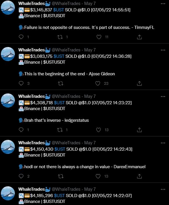 从一个新地址,突然抛售出了 8400 万美元的 UST 开始,多个大户开始疯狂抛售 UST 。由于和 Do Kwon 取出 1.5 亿美元 UST 的行为前脚接后脚,这操作立马吸引住了币圈的注意。而且由于大部分的 UST 都被存在了 Anchor 里面,市场根本就没多少 UST 在流通。大户们这么一砸,突然有些泛滥的 UST 便开始贬值, 1 个 UST 开始不值 1 美元了。