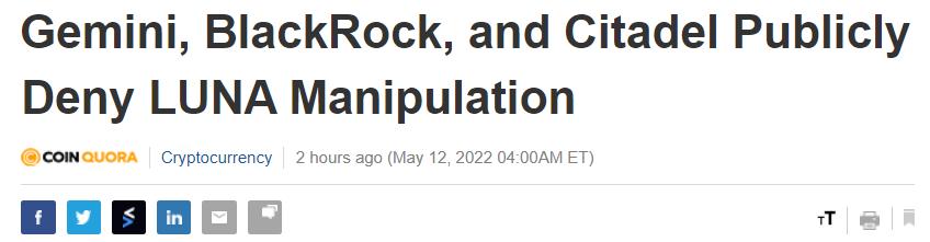 据传言,这次 LUNA 事件背后的最大赢家,共借了 10 万个比特币,其中 2.5 万个比特币换成了 UST 砸盘,剩下的 7.5 万个直接做空。在和 UST 的接盘护盘的大战中,采购来当 LUNA 储备金的数万个比特币,就已经被 Do Kwon 卖出护盘了。。。并且 Do Kwon 在卖出比特币护盘的过程中,流向市场的比特币又压低了市场的价格,让做空的大庄家美滋滋。只不过这传言不保真,因为包括贝莱德、 Citadel 等金融巨头,都否认和这次 LUNA 事件相关。