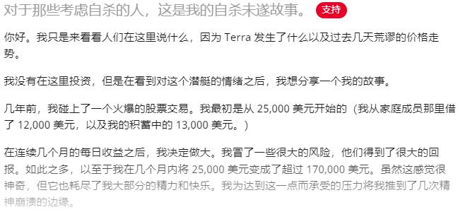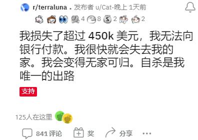 当然在资本们长枪对短炮,镰刀对镰刀期间,普通散户韭菜,永远是被割得最惨的那位。在 Reddit 的 LUNA 小组中,关于炒币血亏的帖子成了最近最多的主题。有人损失了 45 万美元,准备自杀。。。