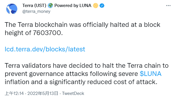 Terra 的稳定币项目(UST),刚刚经历了相当艰难且黑暗的一周。在失去与美元的 1:1 锚定之后,其价格一度跌到了 40 美分。尽管 LFG 宣称寻求超 10 亿美金融资以维持 UST 的币值稳定,但 5 月 10 号当天还是进一步跌到了 30 美分以下。为了在加密货币崩盘的大环境下幸存,陷入困境的 TerraUSD 项目更是在周四将整个区块链(以及广大投资者的 UST 资产)冻结了大约两小时。